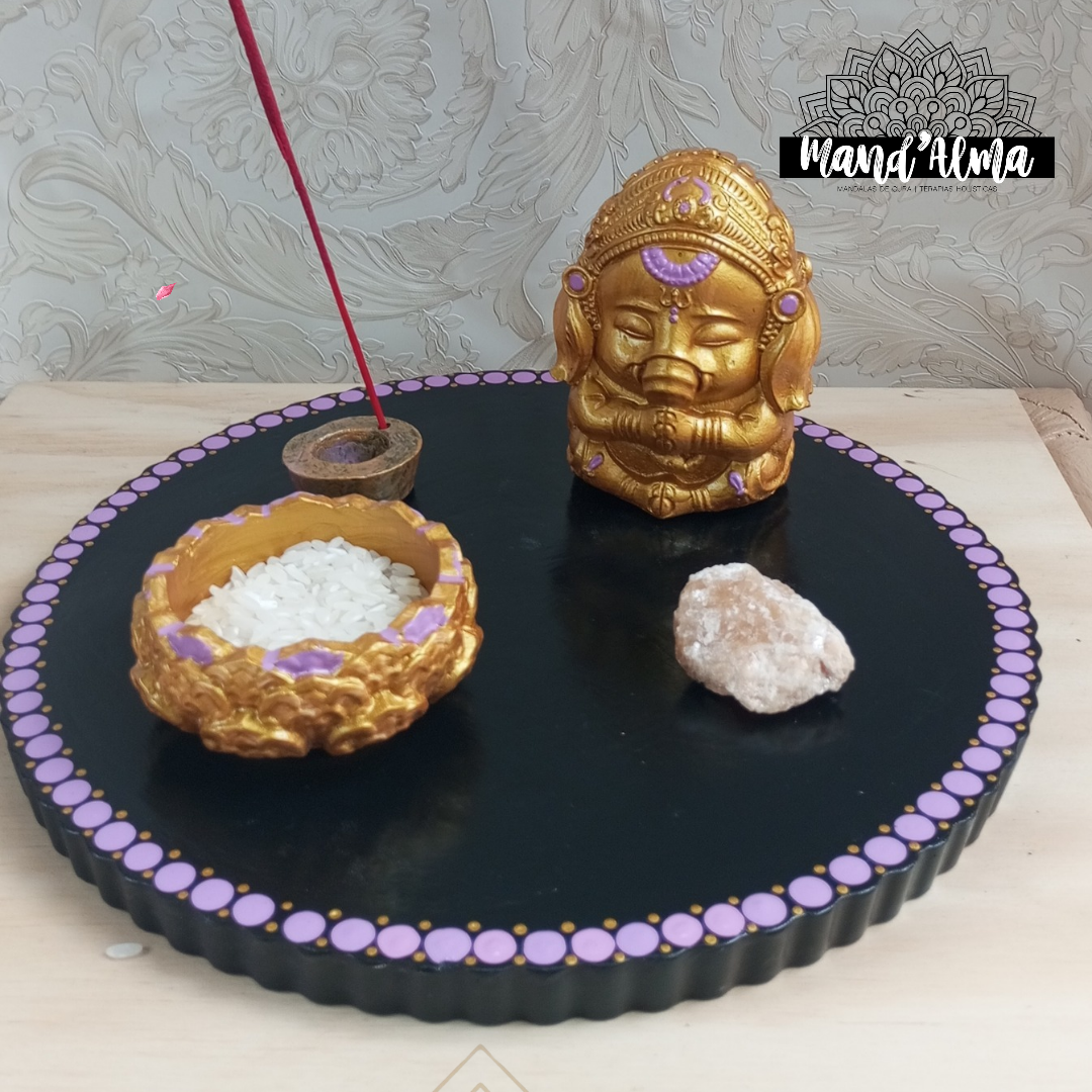 Altar da Prosperidade composto por uma base em gesso cerâmico pintado á mão, uma figura do Deus Lord Ganesha, uma taca em forma de flor de lótus para colocar arroz, louro, moedas e canela para atrair abundância 🌾 um porta incenso (todos igualmente em gesso cerâmico e pintados á mão) e um cristal de citrino.