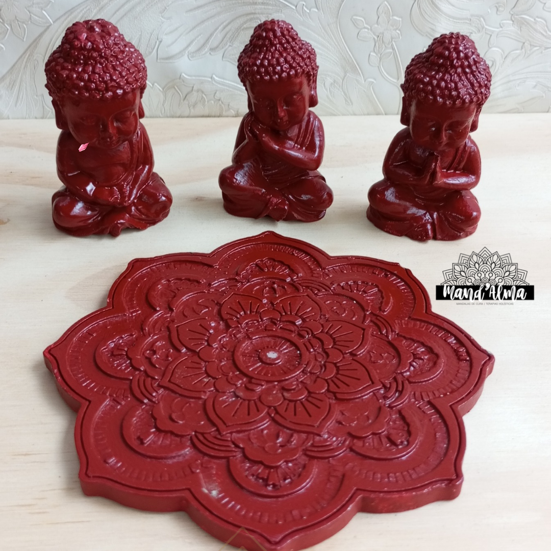 Esta peças e composta por uma mandala do sucesso e três budinhas com mudras diferentes, o da gratidão, meditação e tranquilidade 🪷 são feitos em gesso cerâmico e pintados á mão. A base Mandala funciona como queimador de incenso também.