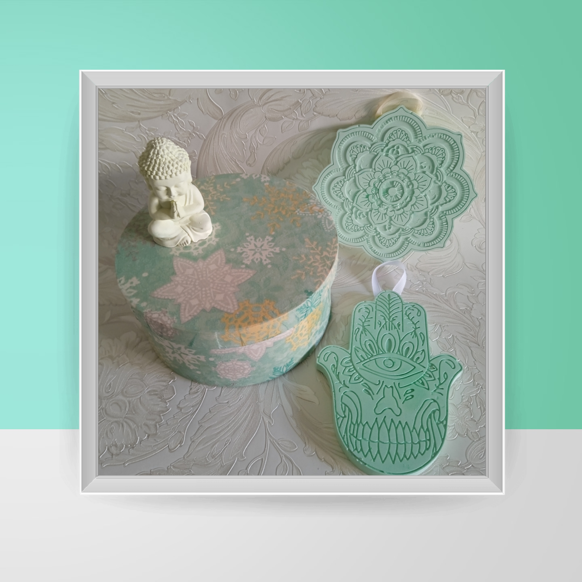 A caixa já incluí frasco de essência para carregar as peças 😊 e as cores são o Verde Água e o aroma é Jasmim .