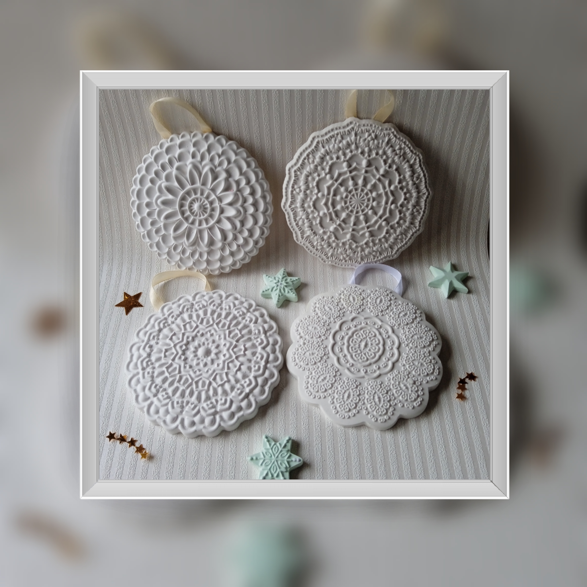 Conjunto de 4 Mandalas Terapêuticas em cerâmica perfumada com aromas delicados e suaves que trazem ao seu ambiente tranquidade, harmonia, amor, prosperidade e sucesso 🤍