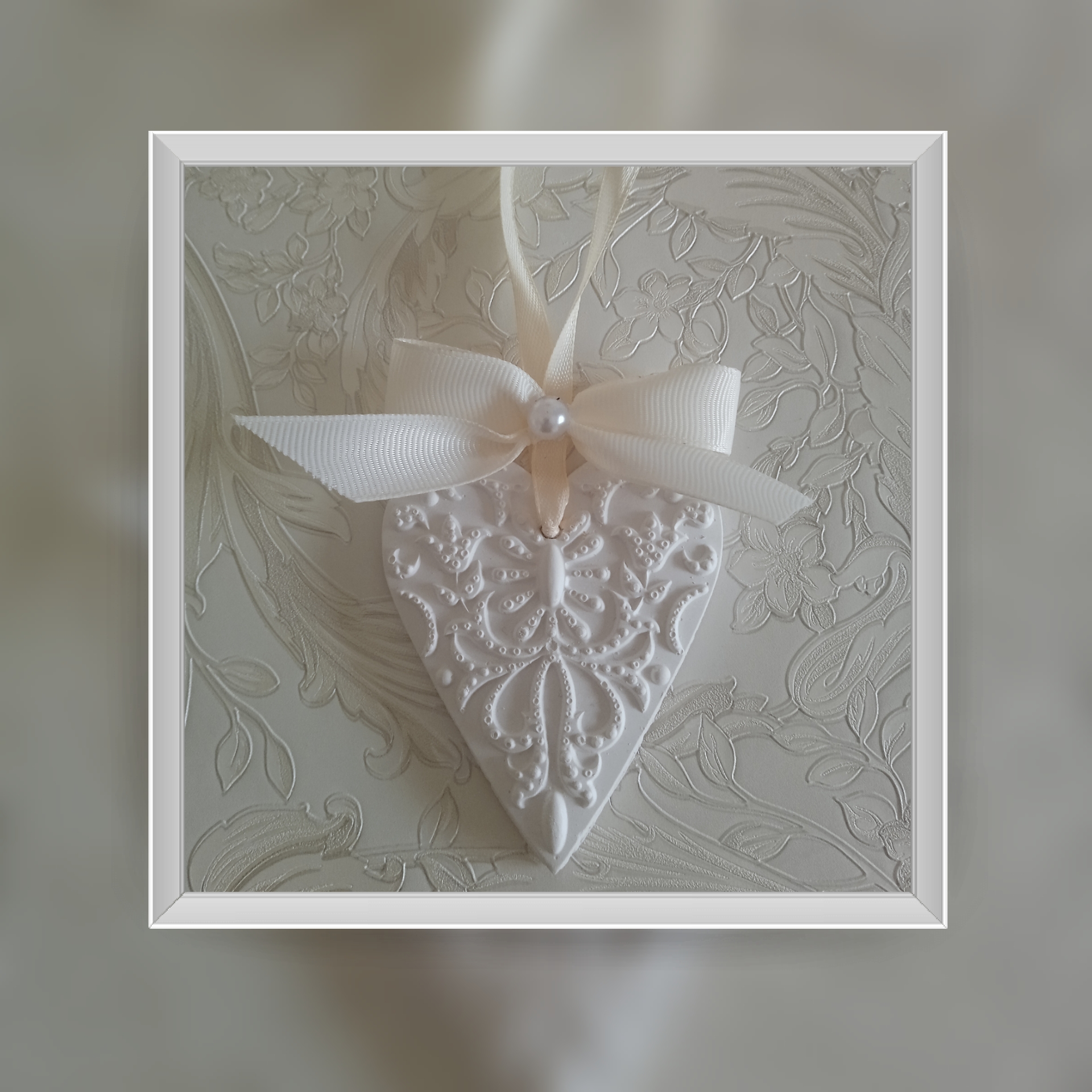 Coração confeccionado em cerâmica perfumada com aromas delicados É entregue em saquinho de linho e recarga de essência.