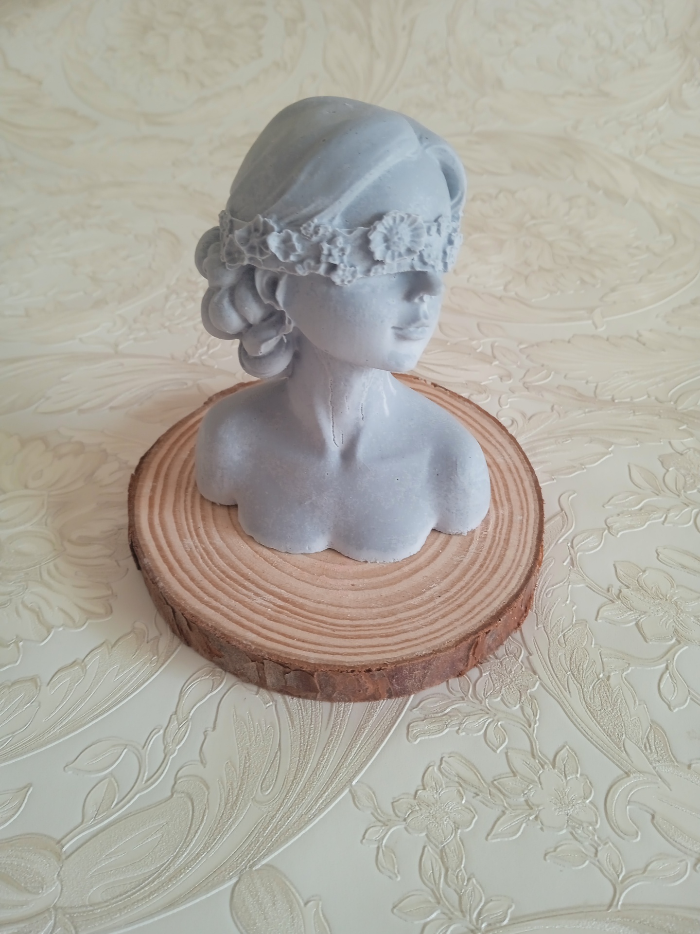 Busto cinza com venda floral sobre base de madeira redonda