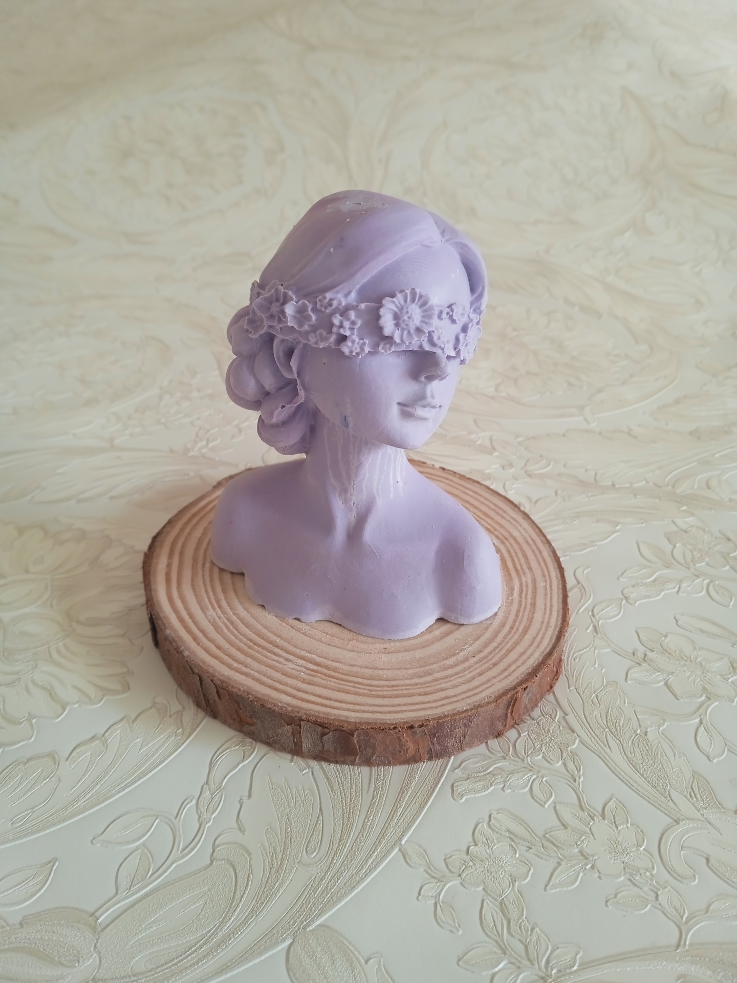 Busto decorativo lilás com faixa floral sobre base de madeira