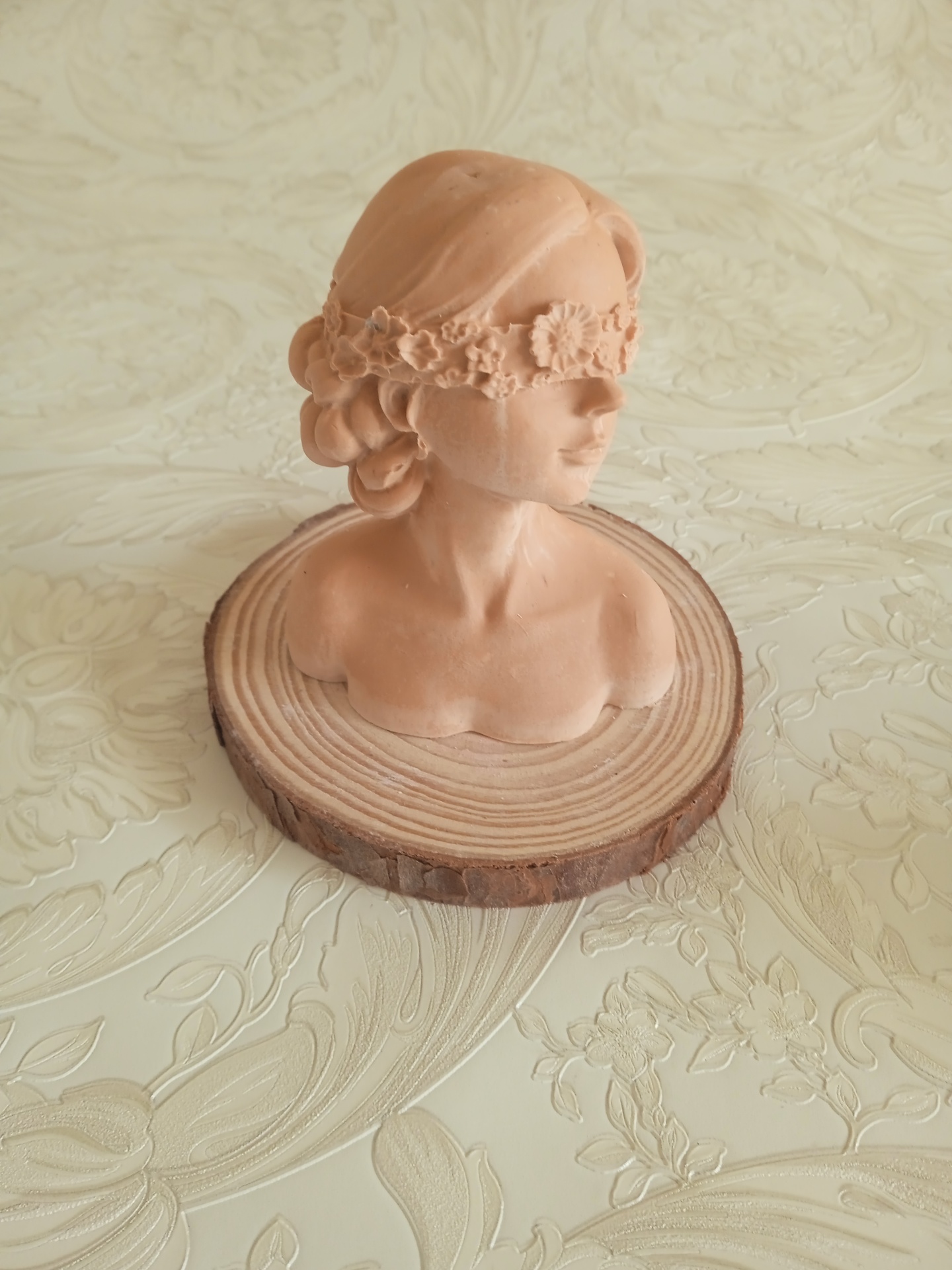 Busto feminino em terracota com faixa floral e base de madeira sobre fundo claro com padrão floral