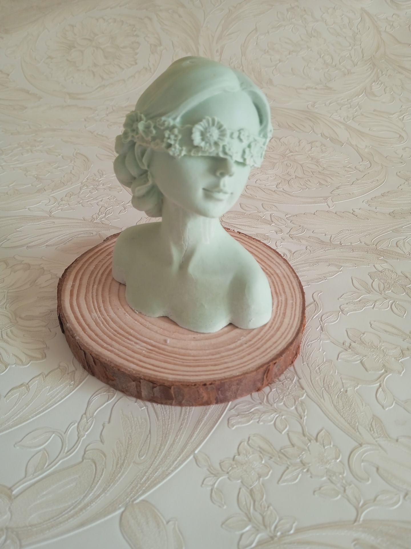 Busto feminino verde claro com faixa floral sobre olhos em base de madeira circular