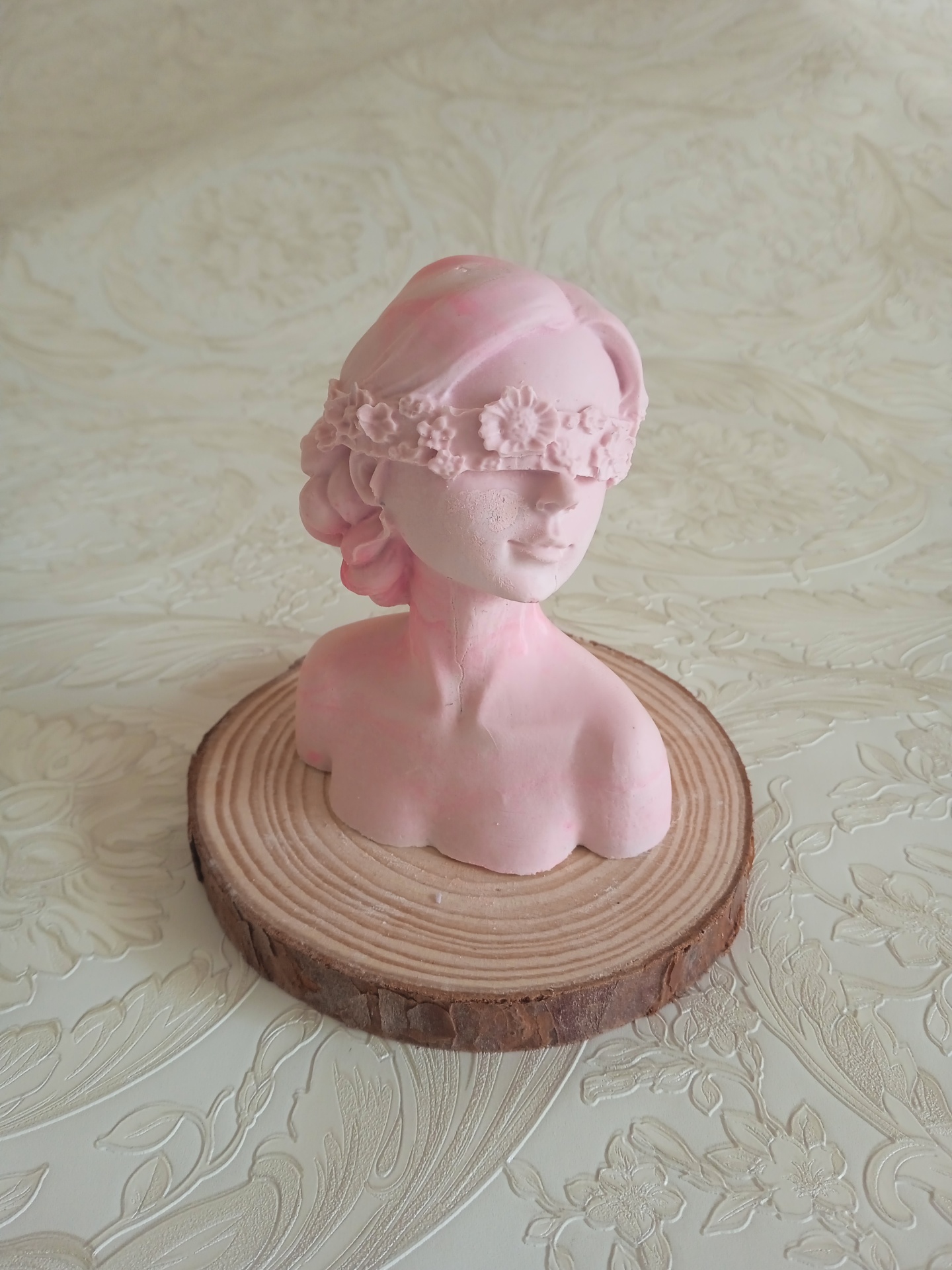 Busto feminino cor-de-rosa com banda de flores a tapar os olhos sobre base de madeira