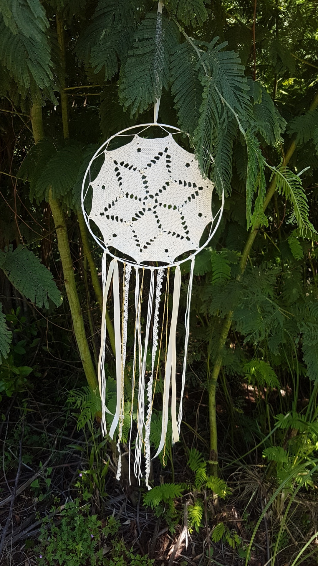 Mandala elaborada em algodão com a estrela de seis pontas. Tem 23 cm de diâmetro e aproximadamente um 1m de altura.