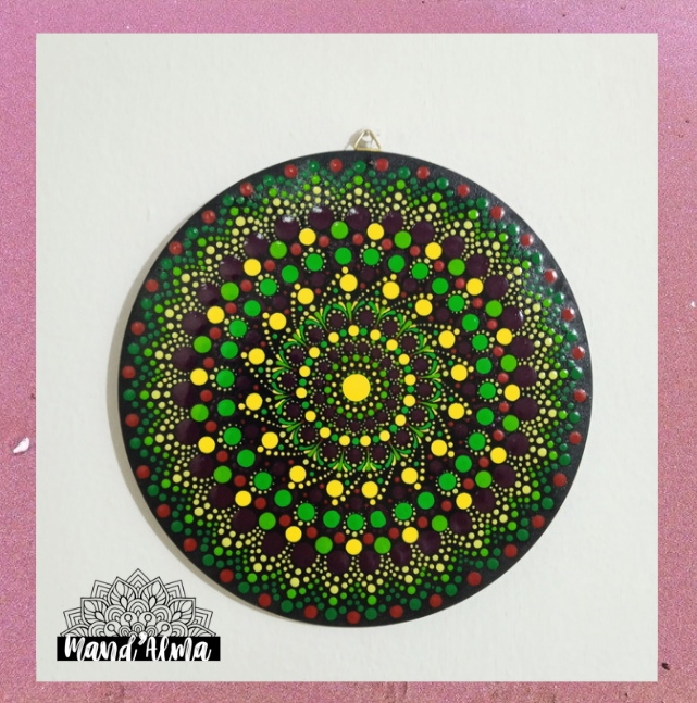 Mandala decorativa pintada a mão com a técnica do pontilhismo, envernizada e pronta a pendurar.