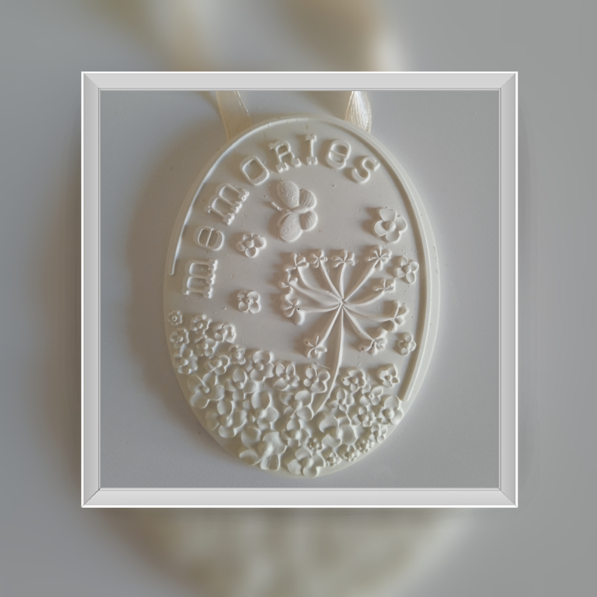 Medalha decorativa branca com relevo de flores e texto 'memórias'