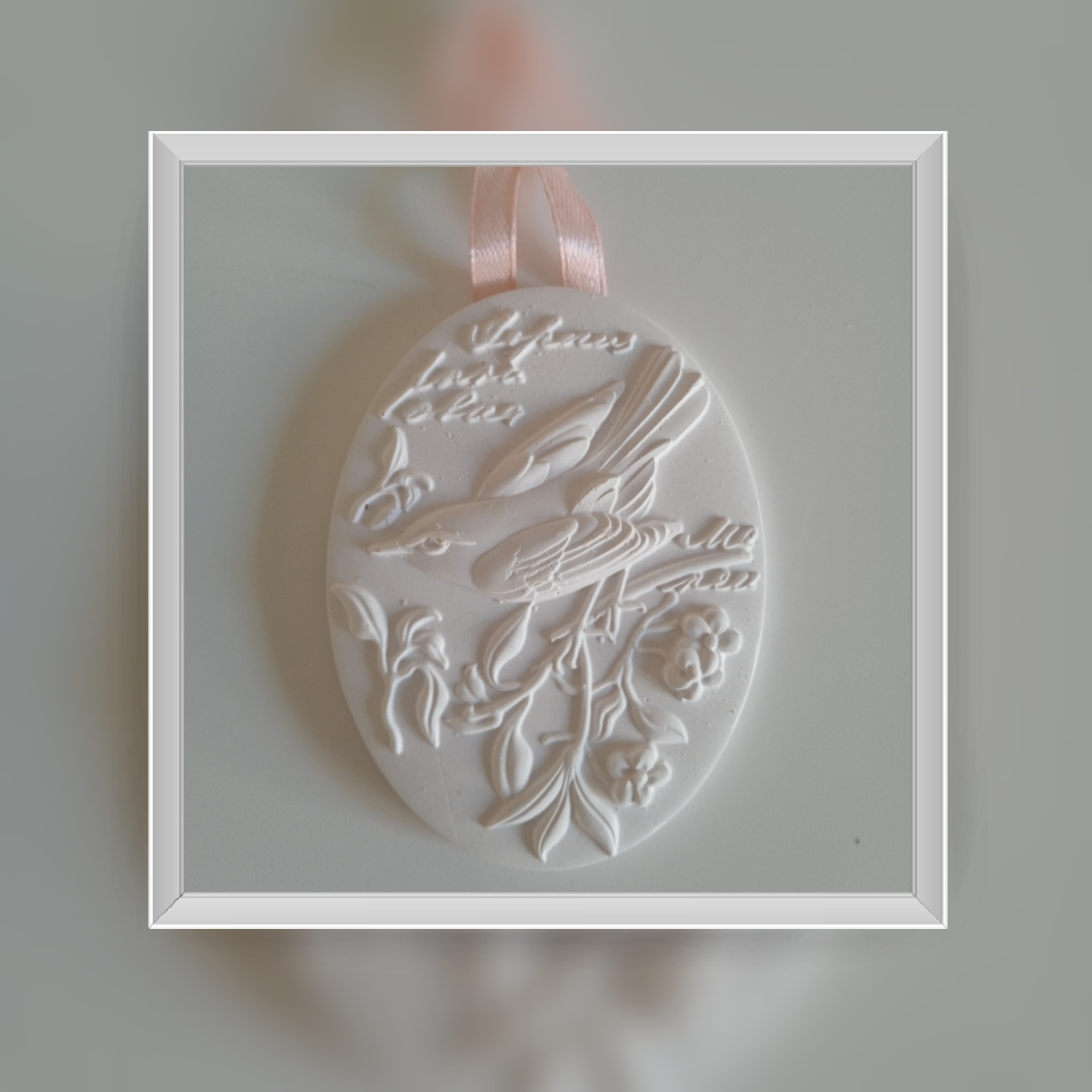 Prenda decorativa oval branca com passarinho e flores em relevo