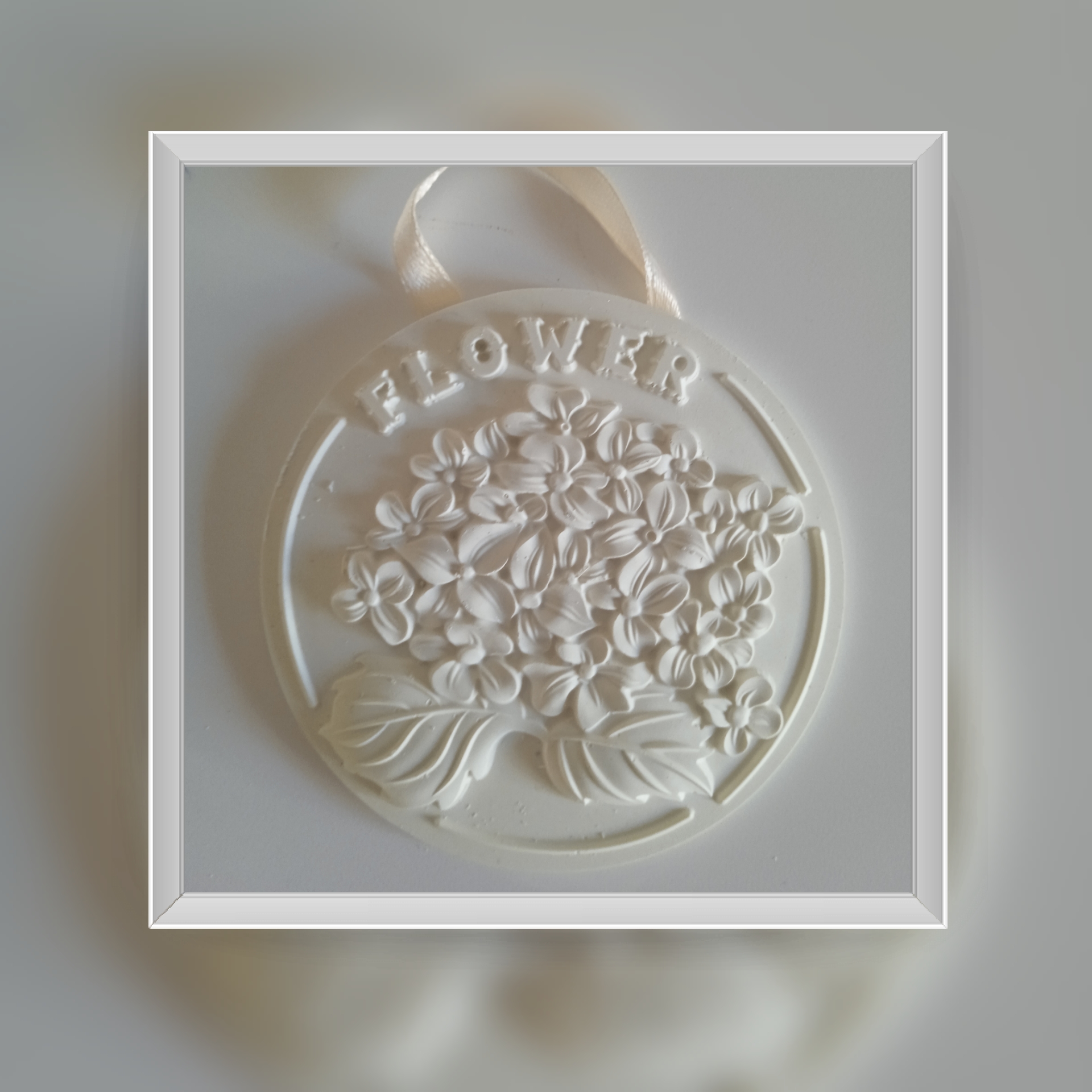 Disco decorativo branco com relevo de flores e palavra FLOWER
