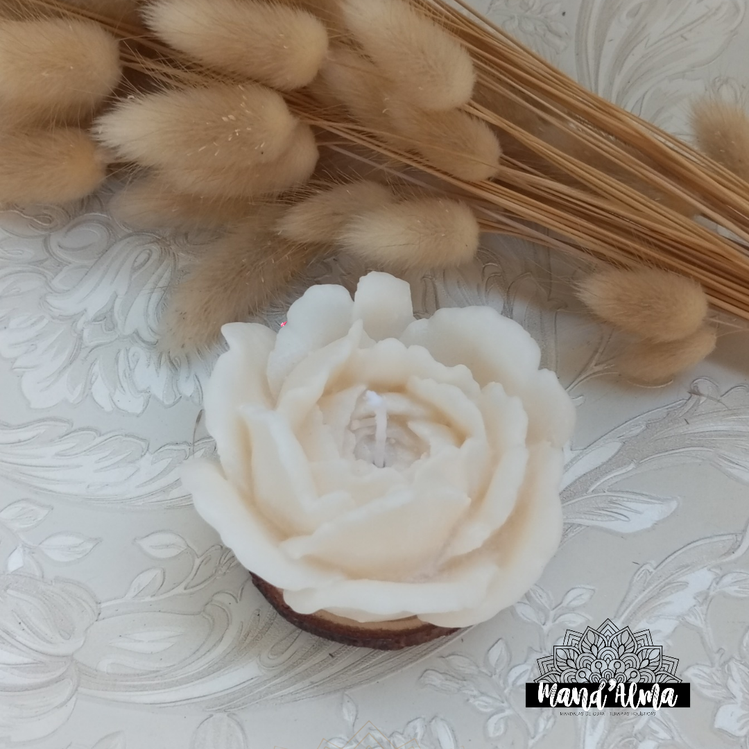 Vela em forma de flor branca sobre base de madeira com ramos secos decorativos