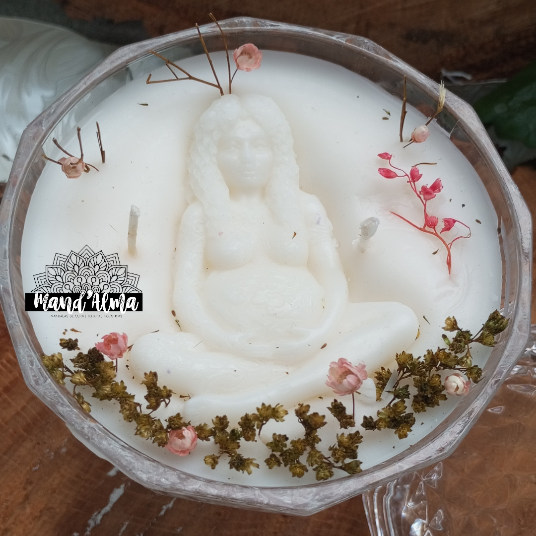 Vela de cera de soja 100% artesanal com a imagem da Deusa de Gaia com detalhes de flores secas. Produzida numa bomboneira de cristal com borla de ceda verde natureza que dá para reutilizar posteriormente 💕