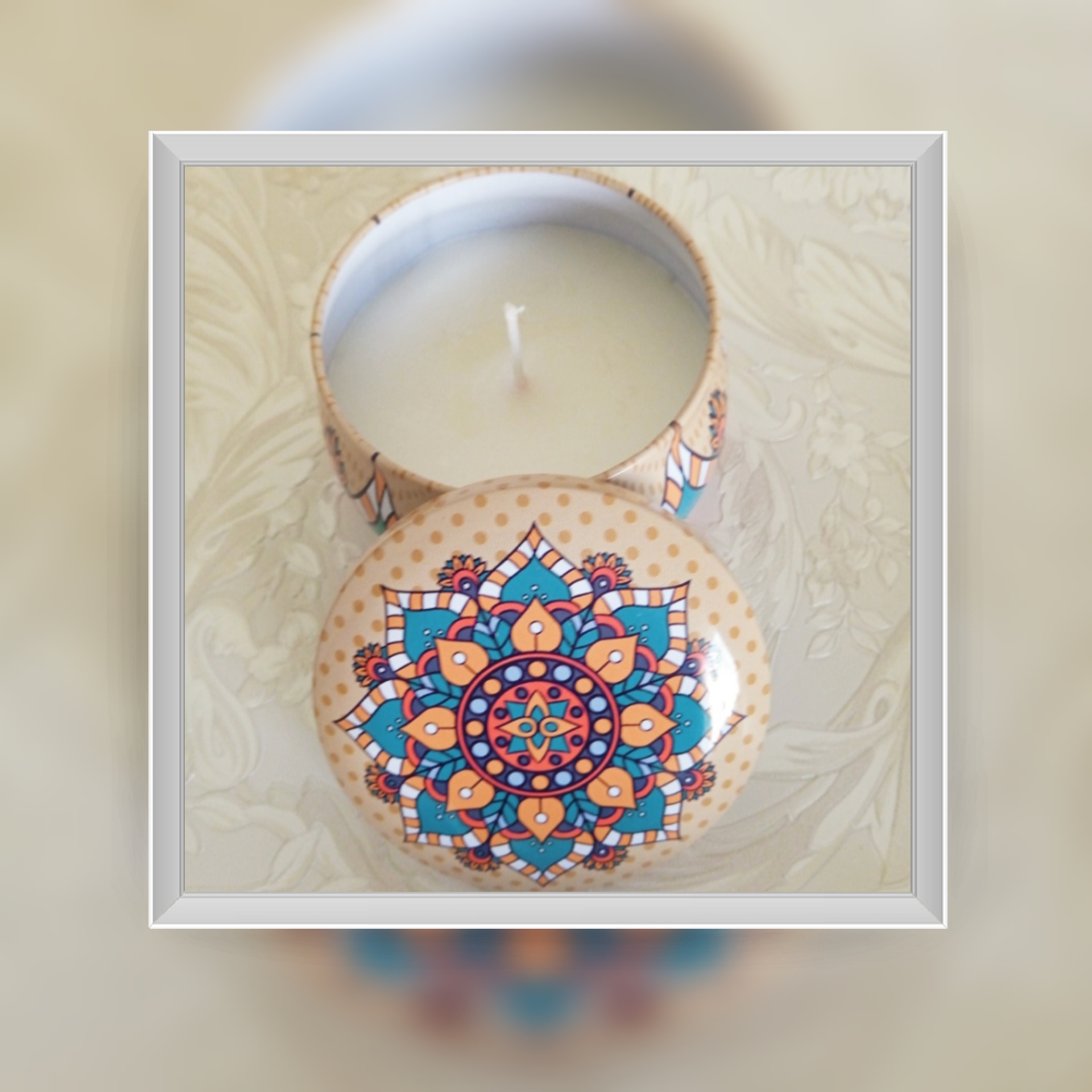 Vela de Soja 100% artesanal com aroma de Flor de Jasmim 🌸 produzida em caixa decorativa Mandala de metal com também.