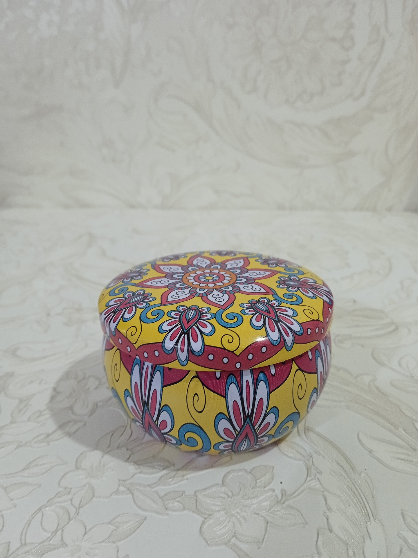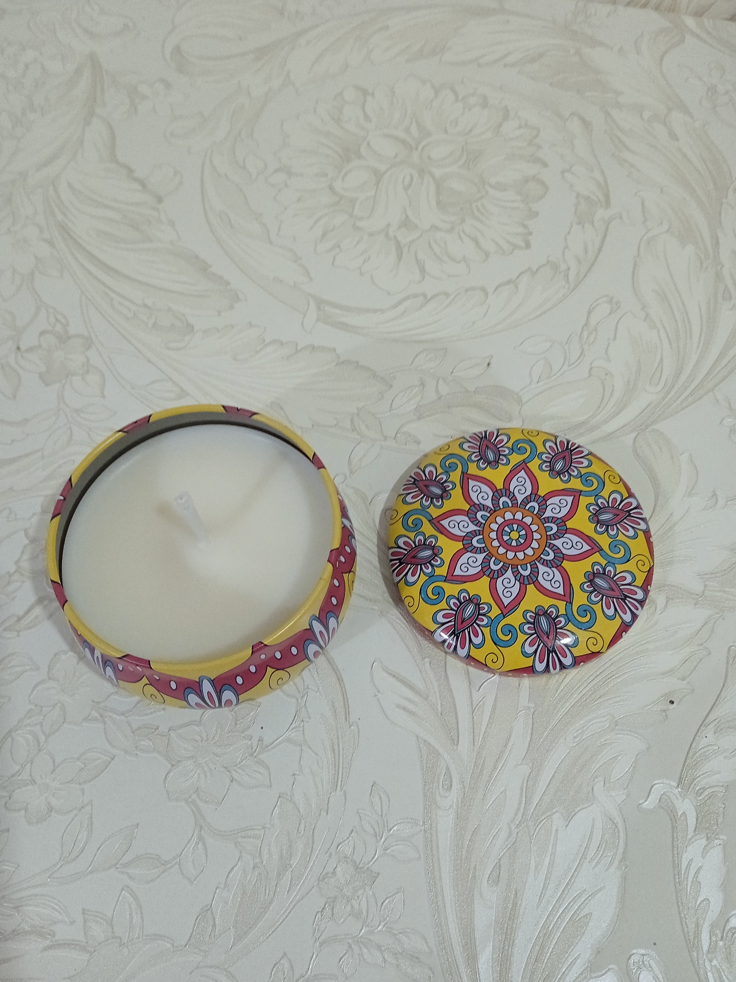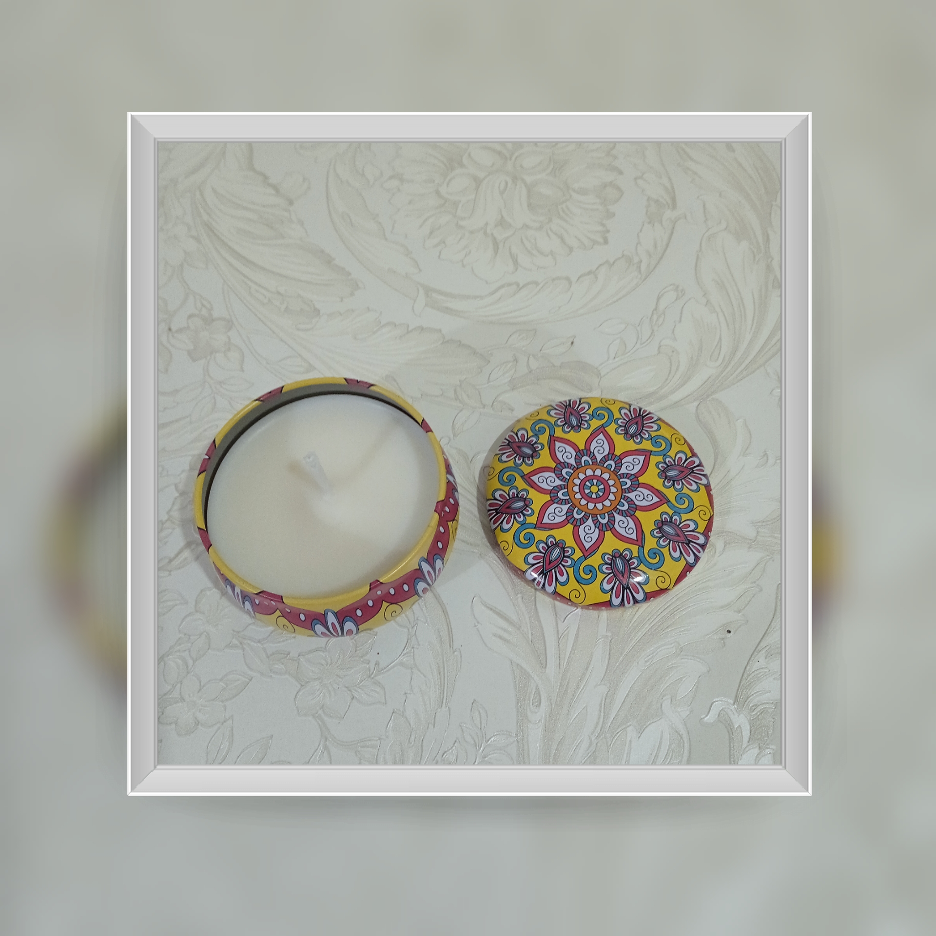 Vela de Soja 100% artesanal com aroma de baunilha e coco 🌸 produzida em caixa de metal decorativa Mandala.