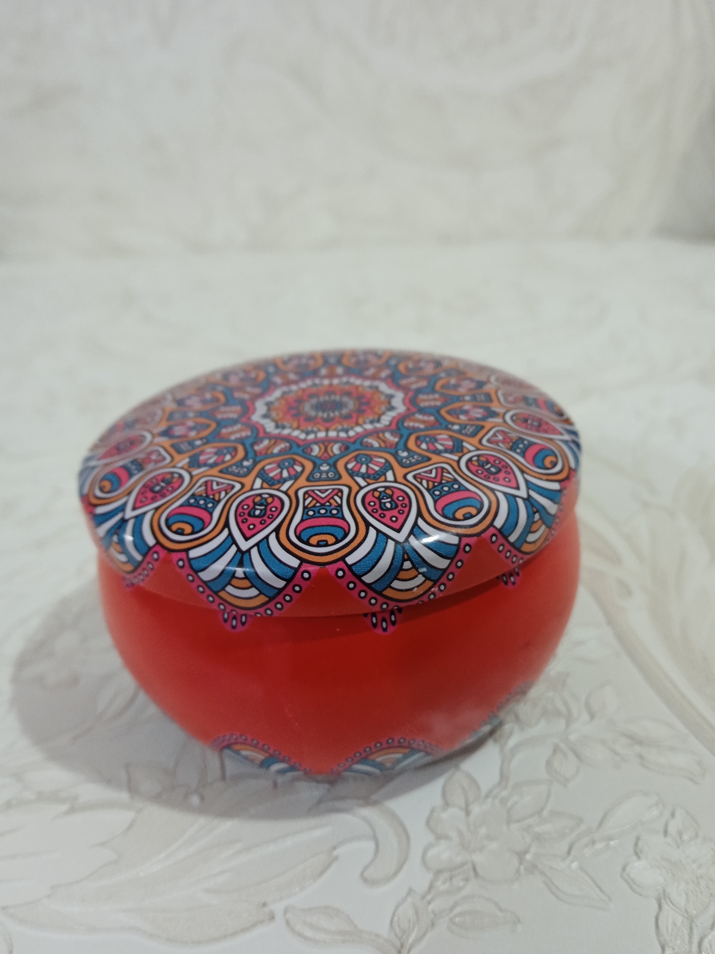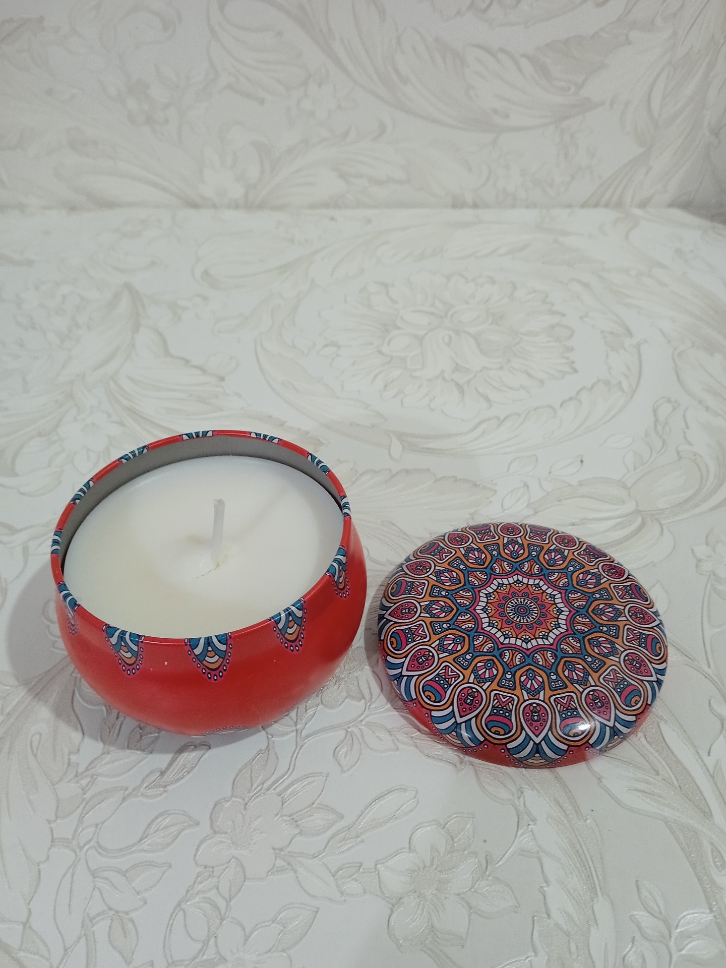 Vela de Soja 100% artesanal com aroma de baunilha e coco 🌸 produzida em caixa de metal decorativa Mandala